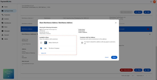 The share modal will list all available customers you are able to share this address with. Check the box next to the ones you would like to share with and select “share” .